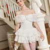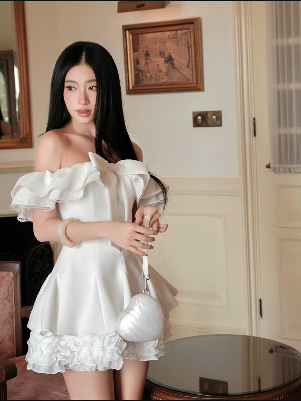 Chiếc đầm trắng trễ vai mang phong cách nhẹ nhàng, sang chảnh giúp nàng nổi bật trong mọi dịp: đi chơi, hẹn hò hay chụp ảnh.