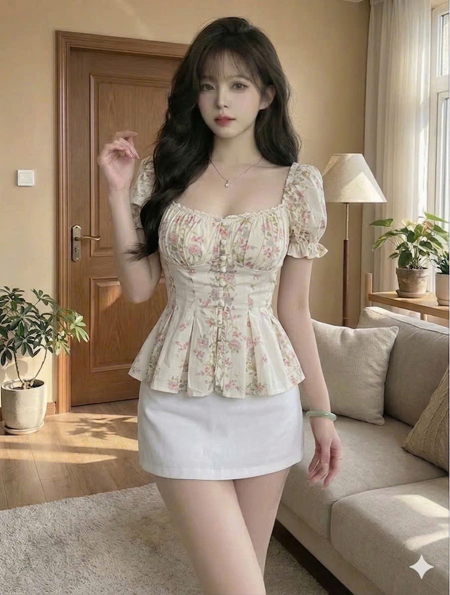 [MÃ SP] Áo Kiểu Hoa Nhí Vintage Cổ Vuông – Thiết Kế Peplum Tôn Dáng & Nhún Ngực Điệu Đà
