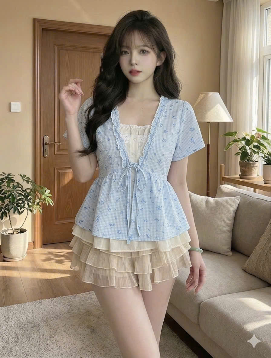 [MÃ SP] Áo Kiểu Xanh Pastel Họa Tiết Caro – Thiết Kế Buộc Dây Phối Viền Bèo