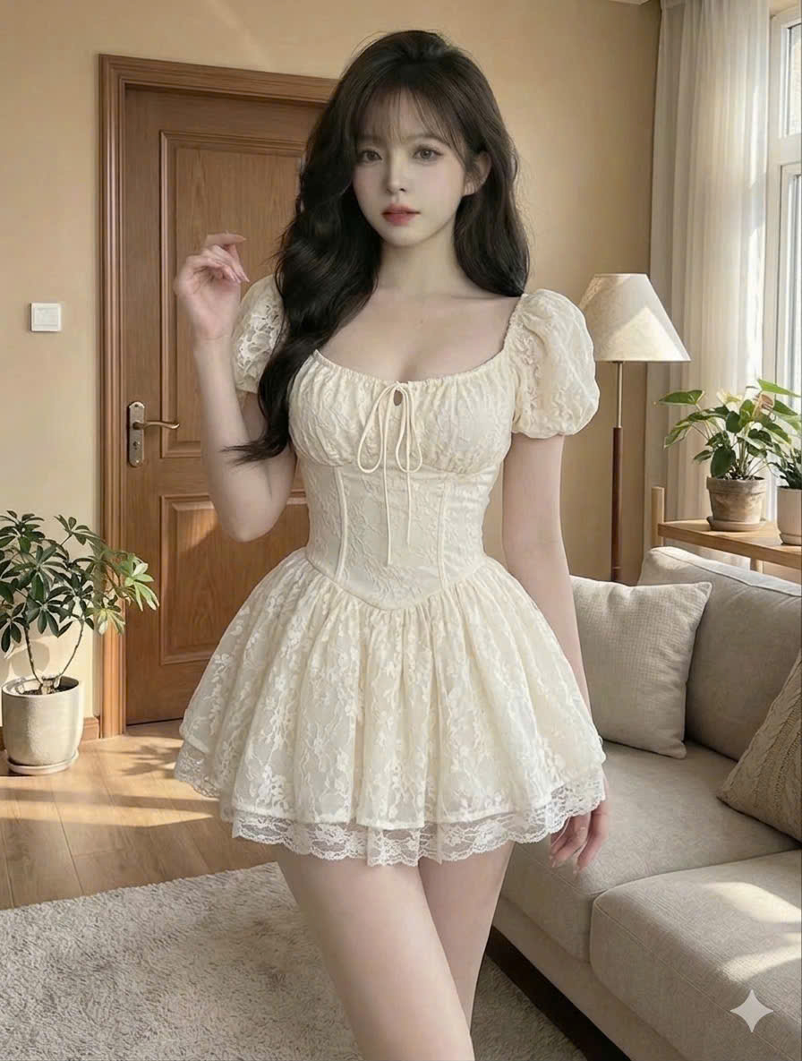 [MÃ SP] Đầm Ren Trắng Kem Tay Bồng – Thiết Kế Corset Vintage